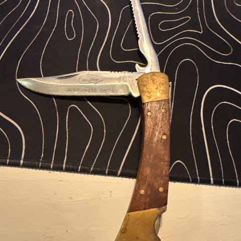 Rostfri Båvö fällkniv med trähandtag. Kniven har ett rostfritt blad märkt "Rostfri Båvö" och "Import" nära skaftet. Skaftet är tillverkat av trä med metallinfattning vid bladfästet. Passar som enklare bruks- eller fickkniv vid exempelvis friluftsliv eller vardagligt bruk där en kompakt fällkniv behövs.