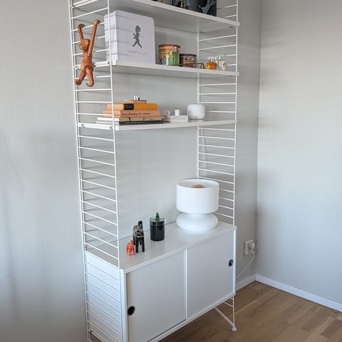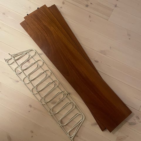 Ovan är AI. Två original stringhyllor med teak plan och vita gavlar. Ca 78 bred 76 hög och 20 djup.