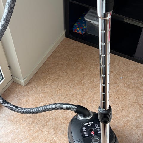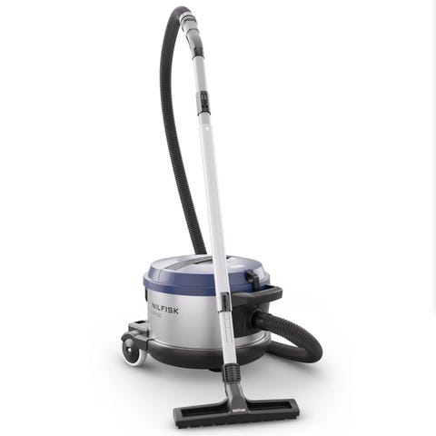 Nilfisk dammsugare med HEPA-filter. Cylindermodell med behållare i metall och mörk toppdel. Utrustad med teleskoprör, golvmunstycke och lång strömkabel. Passar för dammsugning av golv och andra torra ytor i hem eller mindre lokaler. HEPA-märkning på locket indikerar filtrering anpassad för finare dammpartiklar.