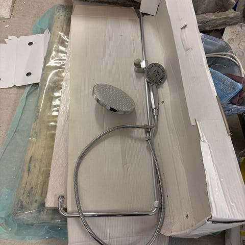 FM Mattsson Garda takduschpaket i krom. Paketet innehåller takdusch med rund duschsil, duschstång, blandarfäste och handdusch med slang. Mått och anslutningar framgår av ritningen och justerbar höjd på duschstången.