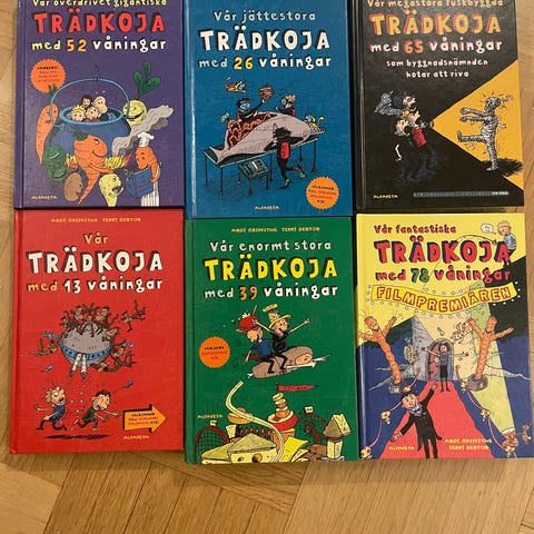 Bokpaket med 6 böcker ur Andy Griffiths serie om trädkojan. Titlarna som ingår är: "Vår jättestora trädkoja med 26 våningar", "Vår trädkoja med 13 våningar", "Vår otroligt gigantiska trädkoja med 52 våningar", "Vår otroliga trädkoja med 39 våningar", ”vår livsfarliga trädkoja med 91 våningar” och "Vår megastora fuskbyggda trädkoja med 65 våningar som byggnadsnämnden hotar att riva". Böckerna är inbundna barn- och ungdomsböcker på svenska med illustrerade omslag.