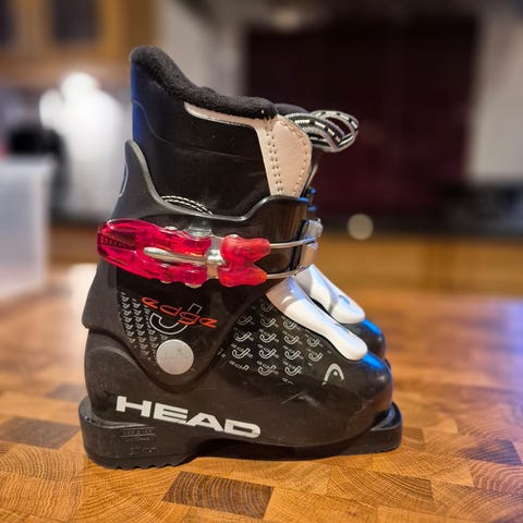 Nordica Powair pjäxor för barn i svart och blå färg. Modellen har hårt ytterskal med justerbart spänne över vristen för att hålla foten på plats. Sulan är mönstrad för bättre grepp vid gång. Passar för alpin skidåkning för barn. Märkningar och grafik med texten "Wham Zip" på yttersidan av pjäxan.