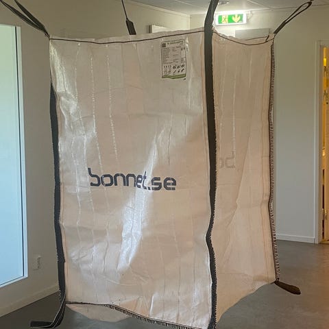 Säcken har nät i botten och på två av sidorna, samt lyftöglor i alla hörn (8 st).