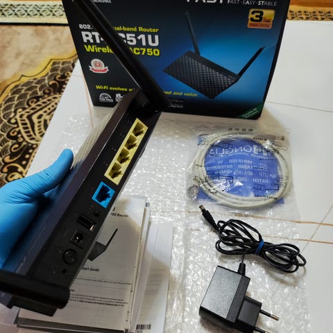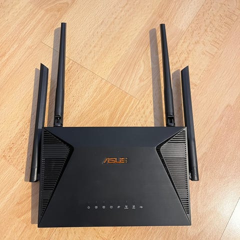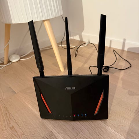 Asus router i svart utförande med tre externa antenner. På baksidan finns flera nätverksportar för kabelanslutning samt USB-portar för anslutning av externa enheter. Routern är avsedd för trådlöst nätverk i hem eller mindre kontor.