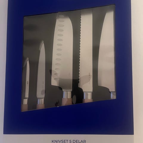 Eva Solo knivblock med tillhörande knivar i rostfritt stål. Knivblocket har flexibel insats som gör att knivarna kan placeras fritt och passar flera olika knivstorlekar. Kommer med tre knivar av mörker Savory Cuisine. Knivarna har användes ett fåtal ggr. Allt inhandlat på Cervera i Fältöversten för ett par månader sedan.