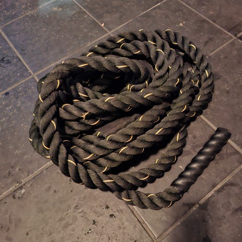 Träningsrep av typen battle rope i svart färg. Repet är flätat och har skyddande överdrag längs hela längden. Ändarna är försedda med greppvänliga handtag i plast för bättre hållbarhet och grepp. Passar för funktionell träning, konditionsträning och styrkeövningar både inomhus och utomhus. 15m långt rep i polyester. Repet är 2" tjockt och väger ca 23kg. Battlingrope är perfekt för att öka nivån på din fysträning. Använbar både för hemma träning eller gymanläggningar. Använd repet för givande helkroppsträning med olika övningar som t.ex Power slam och Wave.