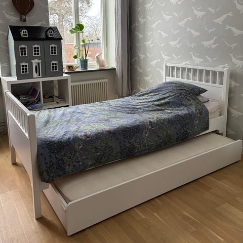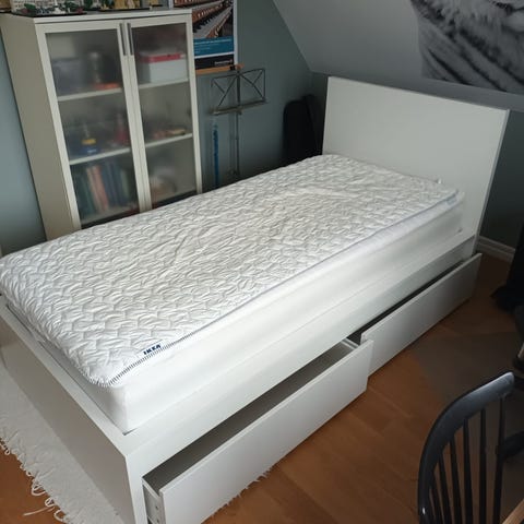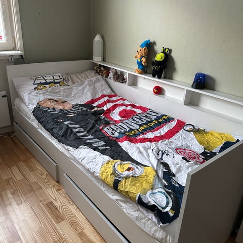 Säljer grabbens vita malmsäng från Ikea. Två förvaringslådor. Storlek 90×200. Madrass medföljer.