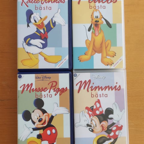 Disney VHS-filmer med Kalle Anka och Musse Pigg. Innehåller bland annat filmen "Här kommer Kalle" med Kalle Anka samt "Musses galna sommar" med Musse Pigg. Klassiska tecknade kortfilmer på VHS-kassett, svenska utgåvor med omslag och kassetter enligt bilderna.