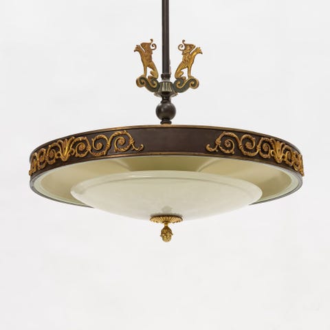 Glas och mässing. I fint skick, men finns några smärre nagg i glaset enligt bilder i kanten som inte syns när den är monterad. Ny el och fullt fungerande. Mått 28 cm i diameter, totalhöjd ca 45 cm.