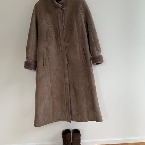 Säljer en otrolig kappa i äkta mocka och fårskinn. Den är i superfint skick, inga fläckar. Oversized och snygg passform. Storlek är inte angiven men jag har vanligtvis medium i kappor och älskar denna avslappnade passform.
