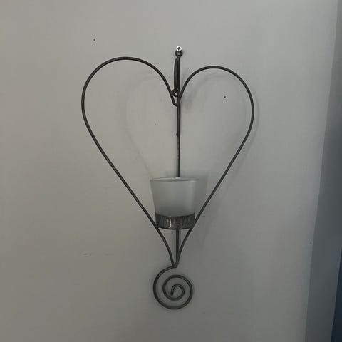 (2 st) mycket dekorativa hängande ljuslyktor i metall/smide med vacker hjärtformad överkant och tillhörande glas insatser.