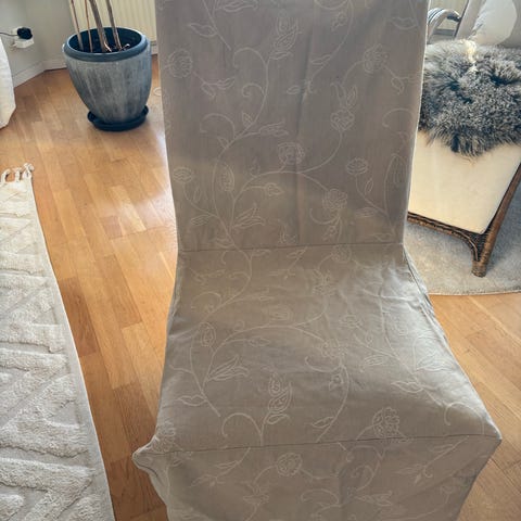 Stolar med överdrag. Märke och ålder okänt. Originaltyg smutsigt men med överdrag ser de fina ut.