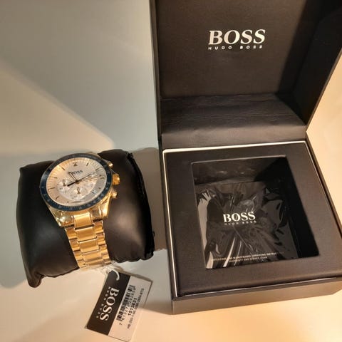 Guldpläterad rostfritt stål boett. Schweiziskt Ronda 5030.D kvartskronografverk. Guldtonad urtavla. Enkelriktad roterande bezel. Push-pullkrona med funktionsknappar. Reptåligt flamfusionsglas. Vattentät till 100 m. Originalförpackning.