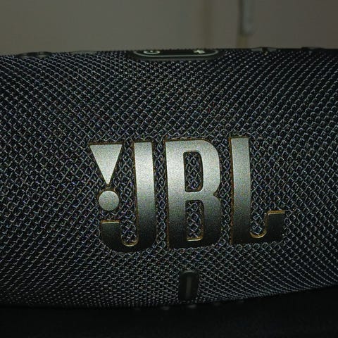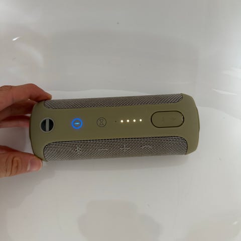 JBL Charge bärbar bluetooth-högtalare i svart färg. Cylindrisk modell med tygklädd front och sidoplacerade passiva baselement. Högtalaren är trådlös och ansluts via bluetooth till mobil, surfplatta eller dator.