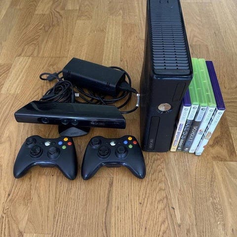 Microsoft Xbox 360 spelkonsol med handkontroll och nätadapter