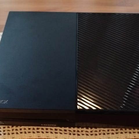 Microsoft Xbox One spelkonsol i svart färg. Konsolen på bilden levereras med nätadapter/strömkabel och en handkontroll.