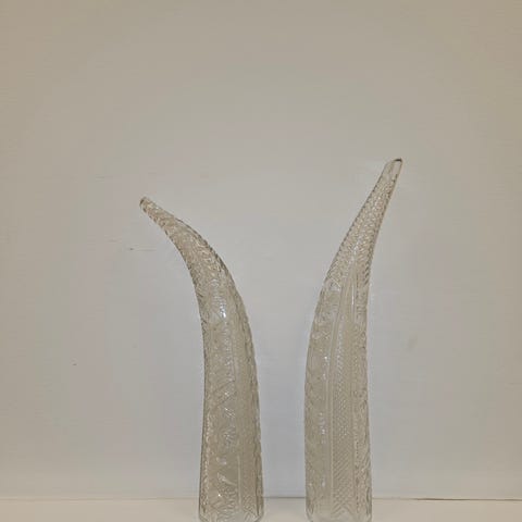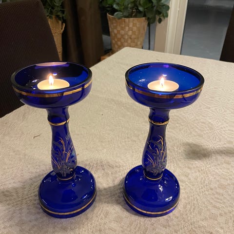 Ett par vackra koboltblå glasvaser, handmålade med intrikata gulddetaljer i antingen bohemisk eller venetiansk stil. Denna typ av glas kännetecknas av sin djupa blå färg och de detaljerade, ofta blommiga eller arabeska, motiven i upphöjd guldemalj. Föremålen är vintage och i gott skick.