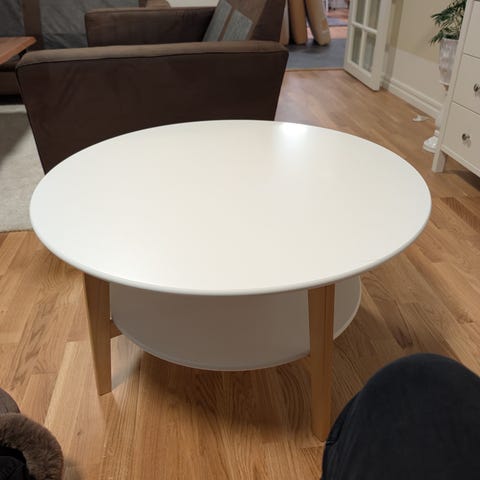 IKEA soffbord set i vitt, bestående av två runda bord i olika storlekar. Borden har fyra ben och en rund hylla undertill för extra avlastningsyta. Passar som soffbord eller sidobord i vardagsrum eller liknande utrymme. Priset gäller för bägge (osäker ang Ikea)