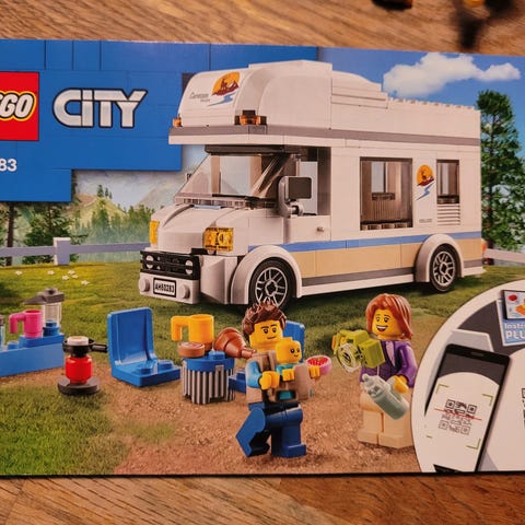 LEGO City 60283 husbil byggset. Innehåller en vit husbil med avtagbart tak och öppningsbar sidodörr samt detaljerad inredning med sittplatser och enklare köksdel. Setet inkluderar familj (mamma, pappa och baby), samt tillbehör som exempelvis mat, dryck och campingutrustning.