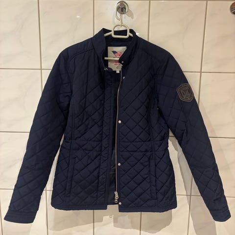 Säljer en klassisk och elegant vårjacka från Lauren Ralph Lauren. Modellen är en quiltad "Riding Jacket" i mörkblått (Navy) med exklusiva detaljer. Jackan har snygga förstärkningar i skinnimitation på axlarna och ett broderat emblem med guldtråd på bröstet.
