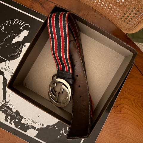 Säljer ett exklusivt Gucci-bälte för barn. Detta är den ikoniska modellen med det elastiska gröna och röda bandet (Web) och detaljer i mörkbrunt läder. Spänne med den klassiska "Interlocking G"-loggan i silver.