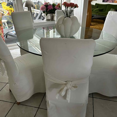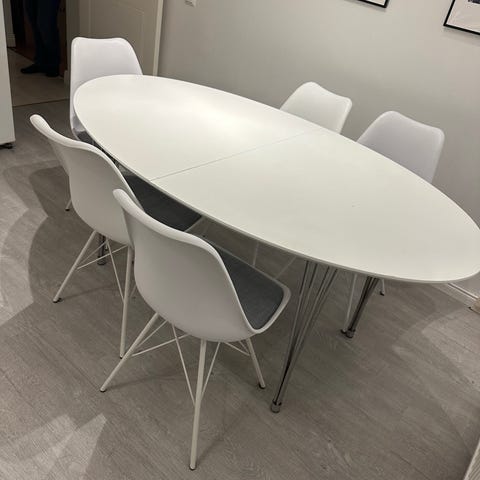 Vit matbord med 4 stolar i ok skickt 105cm diameter stolar ingår I priset 600kr hela.