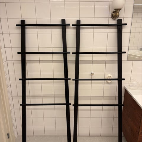 Toaletthylla i svart metall med måtten 65,5 x 24 x 163 cm.