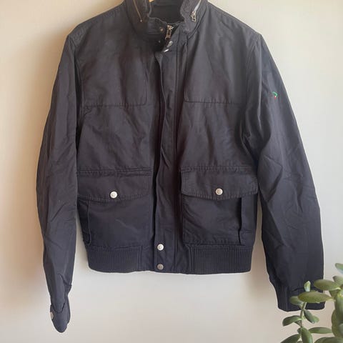 Säljer en klassisk och mångsidig jacka från Tommy Hilfiger. Modellen är en variant av "Harrington/Bomber" med hög krage och muddar i ärmslut och midja som håller passformen snygg. Färgen är en djup marinblå (Navy) med Hilfigers klassiska flagg-detaljer på insidan av kragen.