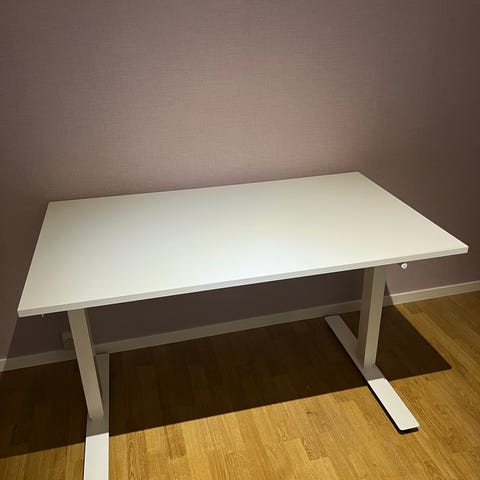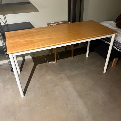 Skrivbord i ”träfaner” med rektangulär bordsskiva och vita metallben. Bordet har en centrerad vit utdragslåda samt två öppna fack på sidorna för förvaring av till exempel papper, böcker eller mindre kontorssaker. Passar som arbetsbord eller studieplats i hemmet.