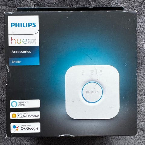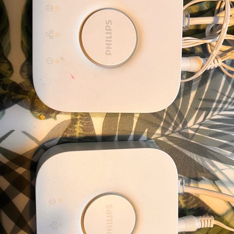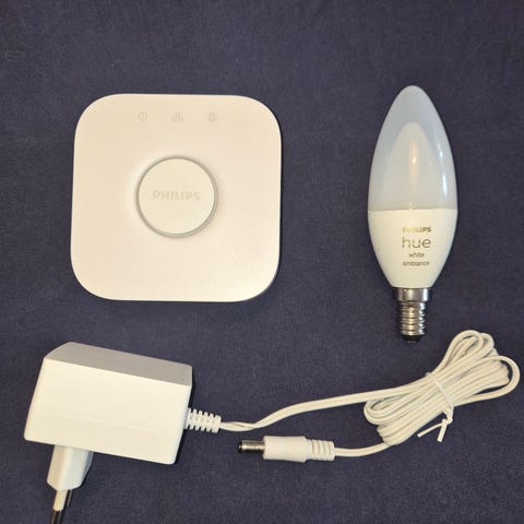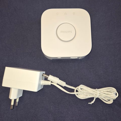 Philips Hue brygga med tillhörande dimmerströmbrytare i vit färg. Bryggan kopplas till nätverket för att styra kompatibla Philips Hue‑lampor och belysning via app eller röststyrning. Dimmerströmbrytaren har knappar för på/av och justering av ljusstyrka. Setet är avsett för inomhusbruk i smarta belysningssystem.