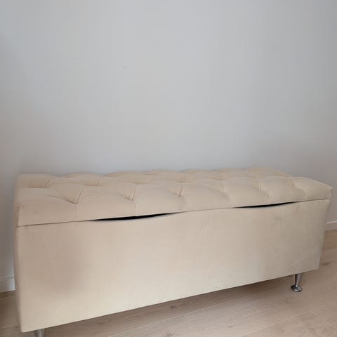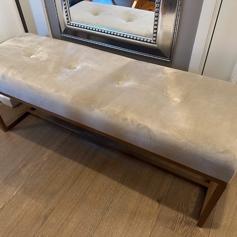 Snygg och stadig stoppad bänk från H&M Home i mjuk beige sammet/velour. Passar perfekt i hallen, vid fotänden av sängen eller som extra sittplats i vardagsrum. Svarta runda ben. HM Home