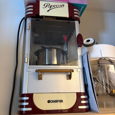 Great Northern popcornmaskin i bordsmodell. Maskinen har röd ram, genomskinliga väggar och inbyggd rostfri gryta för poppning av popcorn. Utrustad med dörr framtill för enkel åtkomst samt behållare i botten för färdiga popcorn. Lämplig för användning i hemmet eller vid mindre sammankomster där man vill göra popcorn på ett traditionellt sätt.En ny maskin kostar 3 000 kronor.