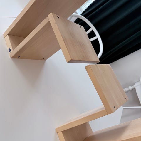 Hyllor i husform och litet bord i vitt. Två mindre vägghyllor/formhyllor i husform placerade på ett litet fyrkantigt bord. Bordet är vitt med raka ben och har en dekorerad bordsskiva. Passar exempelvis i barnrum, hall eller som avlastningsyta i mindre utrymmen. Materialet ser ut att vara trä eller träbaserat material med målad yta.