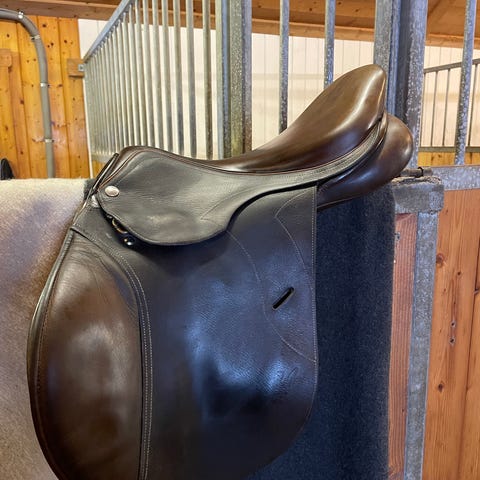Equipe Expression Linnea, begagnad svart hoppsadel 17 tum +2 bomvidd = vid. Uppbyggd +2, normal kåpa, årsmodell 2014.