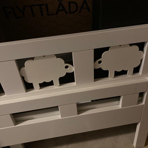 IKEA barnsäng enkelsäng i svart metall med dekorativa gavlar. Sängen har ribbotten i trä enligt bild. Plankorna i ribbotten sitter inte ihop med tygremsan och alla plankor är inte original, men fungerar utmärkt som ribbotten. Storleken är reglerbar. Madrass ingår också, men har en liten fläck. Passar som barnsäng eller juniorsäng i barnrum.
