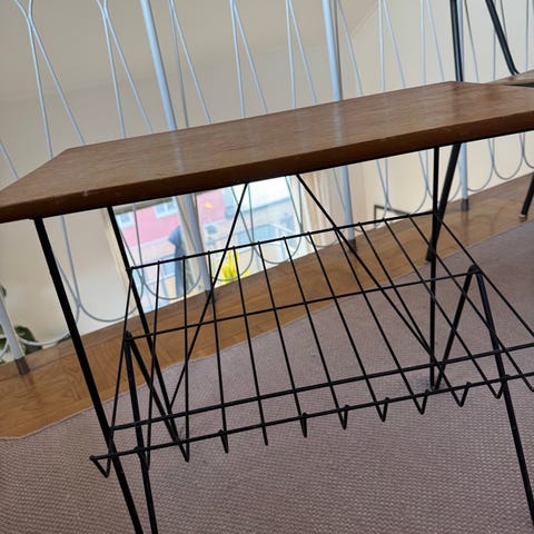 Ett charmigt retro blomsterbord i stringmodell från 1950- eller 1960-talet, med stomme av metall och teakfaner. med en tidstypisk design. Bruksskick med lätt patina som hör åldern till. Stabil konstruktion. Inga större skador eller sprickor. Se bilder för detaljer.