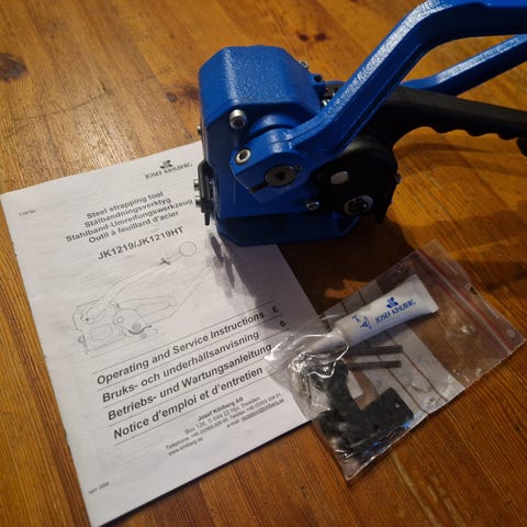 Isborren har tvåhandsgrepp med reglage på handtaget samt bränsletank monterad ovanpå motorn. På bilderna syns även en separat metalladapter/fäste som kan användas tillsammans med isborren. Adapterns diameter är