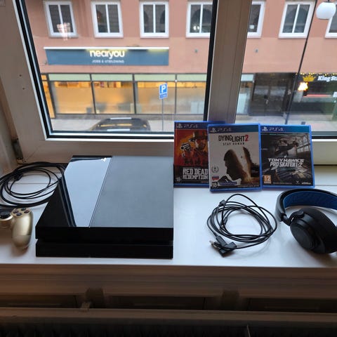 Ps4,1 handkontroll, 1 extern hårddisk samt ett antal spel. Funkar fint