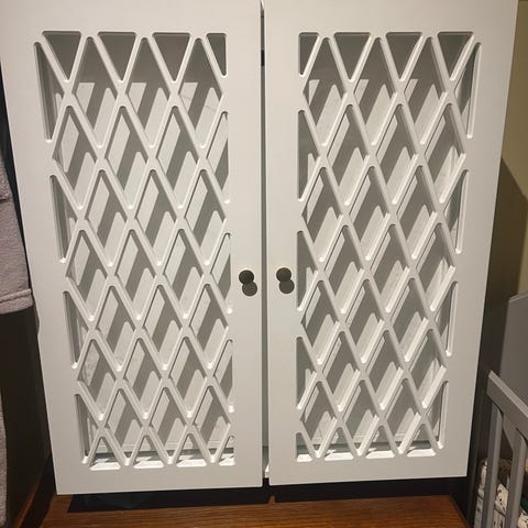 Artek spegelskåp för barn i vit färg. Skåpet har helkroppsspegel på framsidan och invändig förvaring med flera hyllplan. Ramen är i vitlackerat material och spegeln är omgiven av dekorativa knappar eller lampdetaljer. Passar som förvaringsmöbel i barnrum för till exempel accessoarer, leksaker eller kläder.