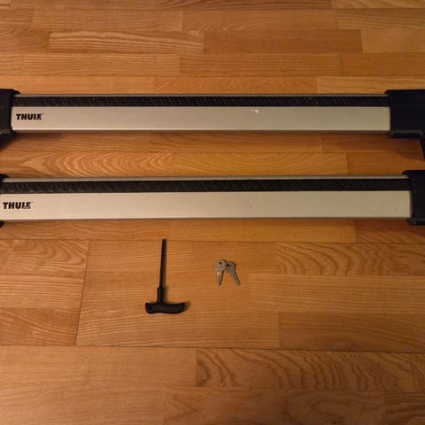 Thule cykelhållare och takräcke i aluminium. Cykelhållaren monteras på takräcket och är avsedd för transport av cykel på bilens tak. Takräcket består av två aluminiumprofiler med fästen för montering på bilens tak. Passar för bilar med kompatibelt takfästesystem och Thule-tillbehör för cykeltransport. Den har suttit på en Toyota Auris