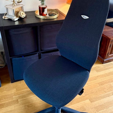 Säljer vår kontorsstol med rottingrygg och sammetsmjuk sits i grönt