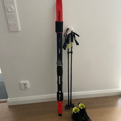 Komplett kit med skidor, pjäxor och stavar.