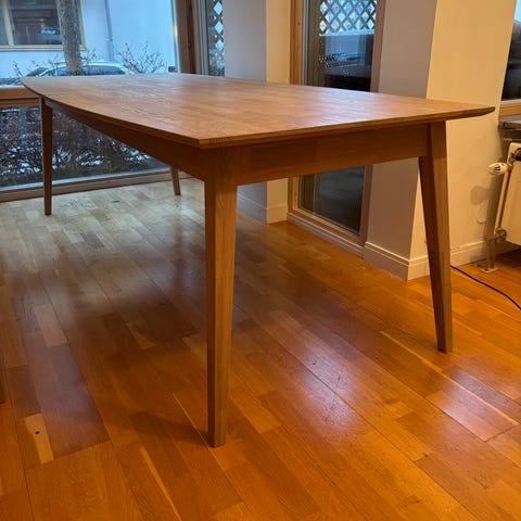 Vi säljer vårt älskade matbord i ekfaner från Sleepo som vi haft många härliga middagar vid! Bordet har lite defekter, se alla bilder. Det är inget som stört oss och den runda ringen i mitten som tyvärr inte går bort har vi alltid haft ex ett fruktfat över så inget som vi tänkt på.