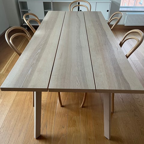 Matbord i ljust ek från Stalands möbler med iläggsskiva, kan alltså bli 120+45 cm! Fint skick!