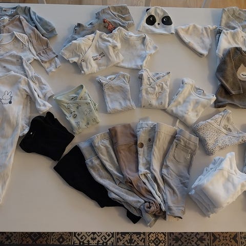 Mycket bra skick. En del plagg upprättade men aldrig använda. Newbie, basic u, åhlens, hm, hommade mfl. 480 kr dvs. 15 kr plagget.