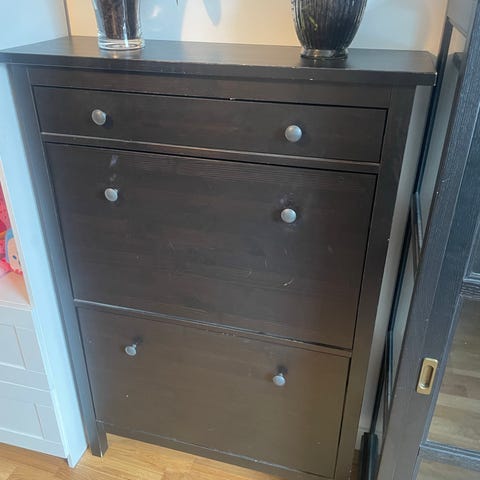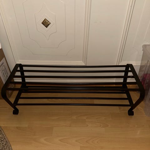 Vit skohylla med plats för ca 8 skor.