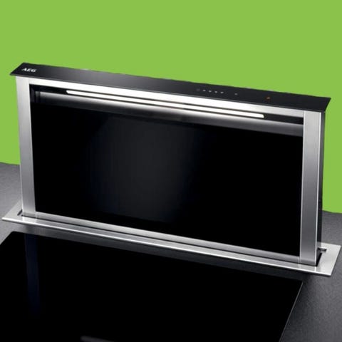 Helt ny Franke Next Plus köksfläkt med kupa, 80 cm bred. Modellen är avsedd för montering ovanför spis eller häll i kök. Fläkten har rak, kantig design med väggmonterad skorsten.