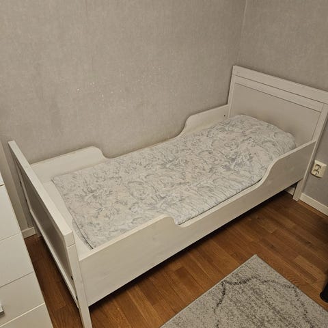 IKEA juniorsäng i vit färg. Sängen har ryggstöd och gavlar med utskurna motiv samt enkla raka ben. Passar som övergångssäng mellan spjälsäng och fullstor säng för barn. Madrass inkluderat finns även sido skydd om man vill ha de.