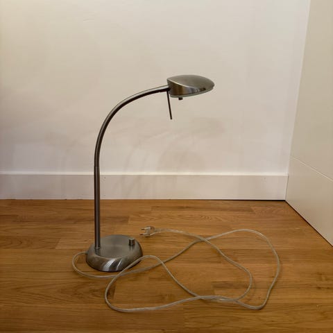 Skrivbordslampa Unilux köpt på Kinnarps. Silverfärgad med 2-stegsbrytare. 2-stifts Lampsockel för halogen eller LED.
