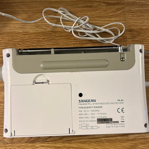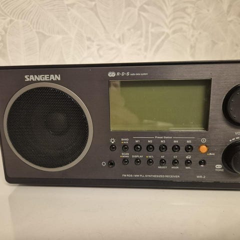 Sangean PR-D4P FM/AM digital radio. Modellen har digital display med klocka, förinställningsknappar för radiokanaler, volymratt på sidan samt teleskopantenn. Utrustad med hörlursuttag och ingång för extern strömförsörjning (DC IN 6V/400 mA). Batterifack på baksidan för portabel användning. Lämplig som bordsradio eller portabel radio för FM- och AM-mottagning. Är endast uppbackad men inte använd så det är nyskick.